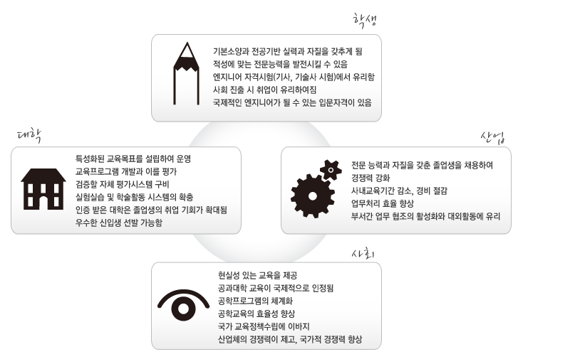 공학교육인증 평가에 따른 인증효과는, 학생, 산업체, 나아가 국가에 이르기까지 공학기술의 경쟁력을 향상시키는 결과를 가져오게 한다.