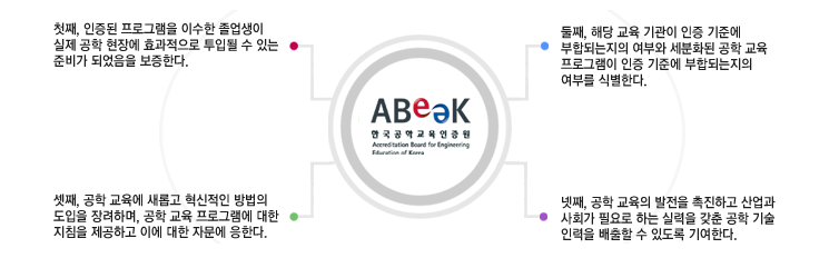 공학 및 관련 교육을 위한 교육 프로그램 기준과 지침을 제시하고, 이를 통해 인증 및 자문을 시행함으로써 공학 교육의 발전을 촉진하고 실력을 갖춘 공학기술 인력을 배출하는데 기여하기 위한 것으로 인증의 목적은 다음 4가지로 정리 할 수 있습니다.